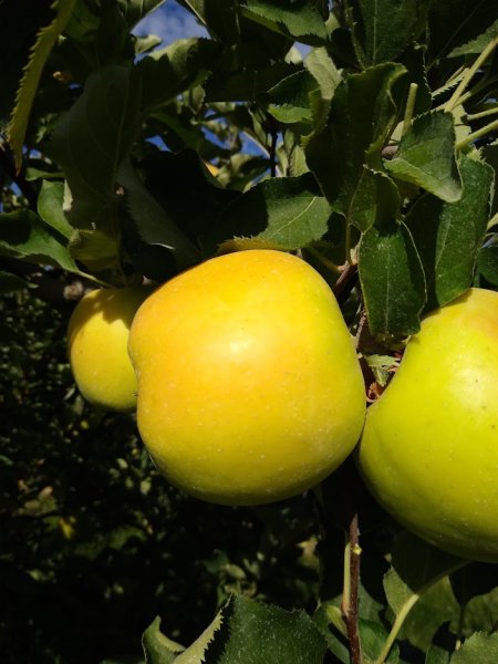 Mutsu is an excellent dessert apple. It is a Golden Delicious cross but tends to be larger, much heavier and denser. Late October through Tnanksgiving is when Mutsu is in it's prime. These apples may have a bit of scarring from hail this year.